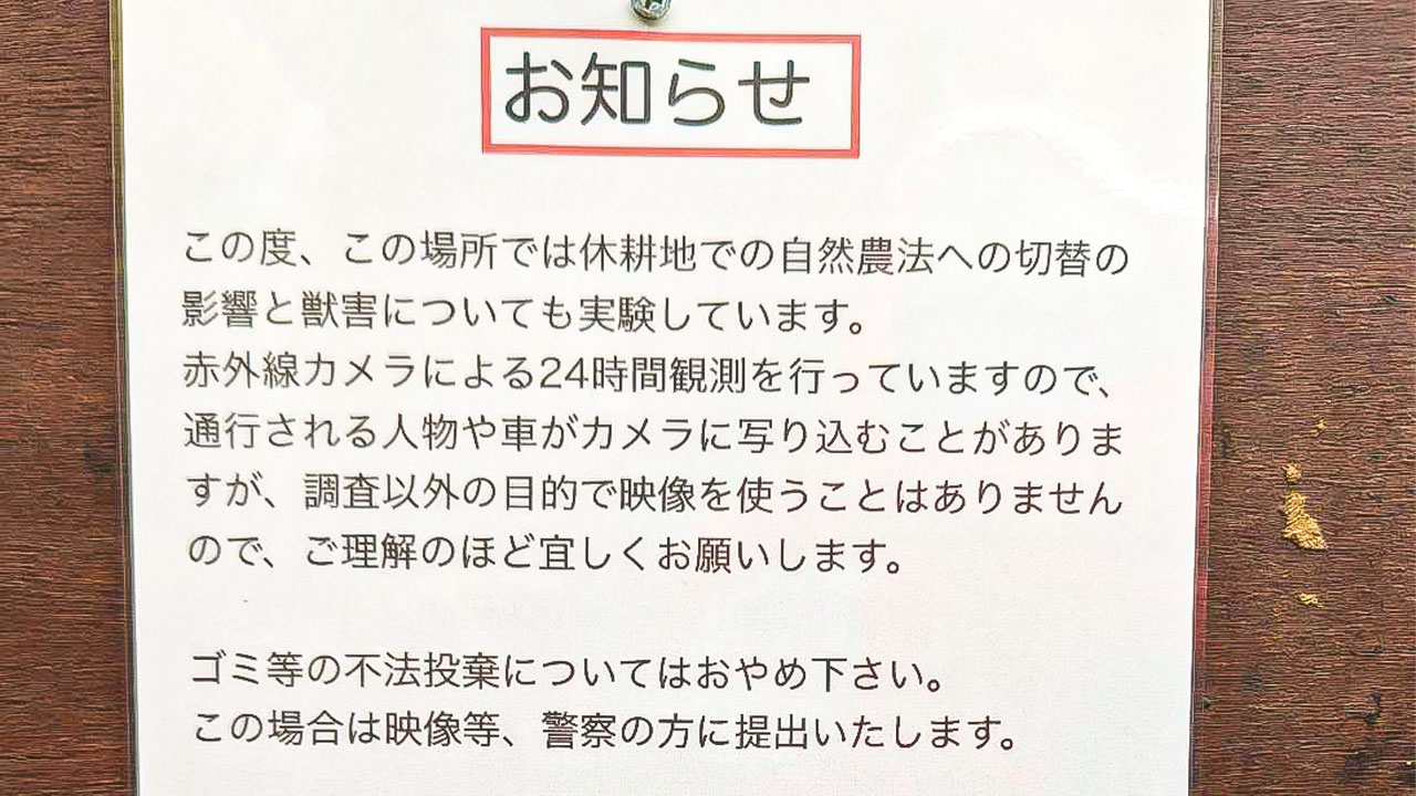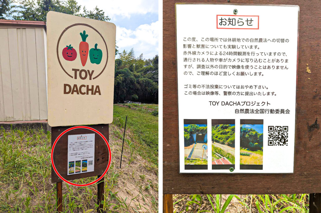 看板にも書いていますが、この土地はTOY DACHAプロジェクトとしての趣味の部分と「休耕地での自然農法への切り替えの影響と獣害についての実験」も兼ねています。